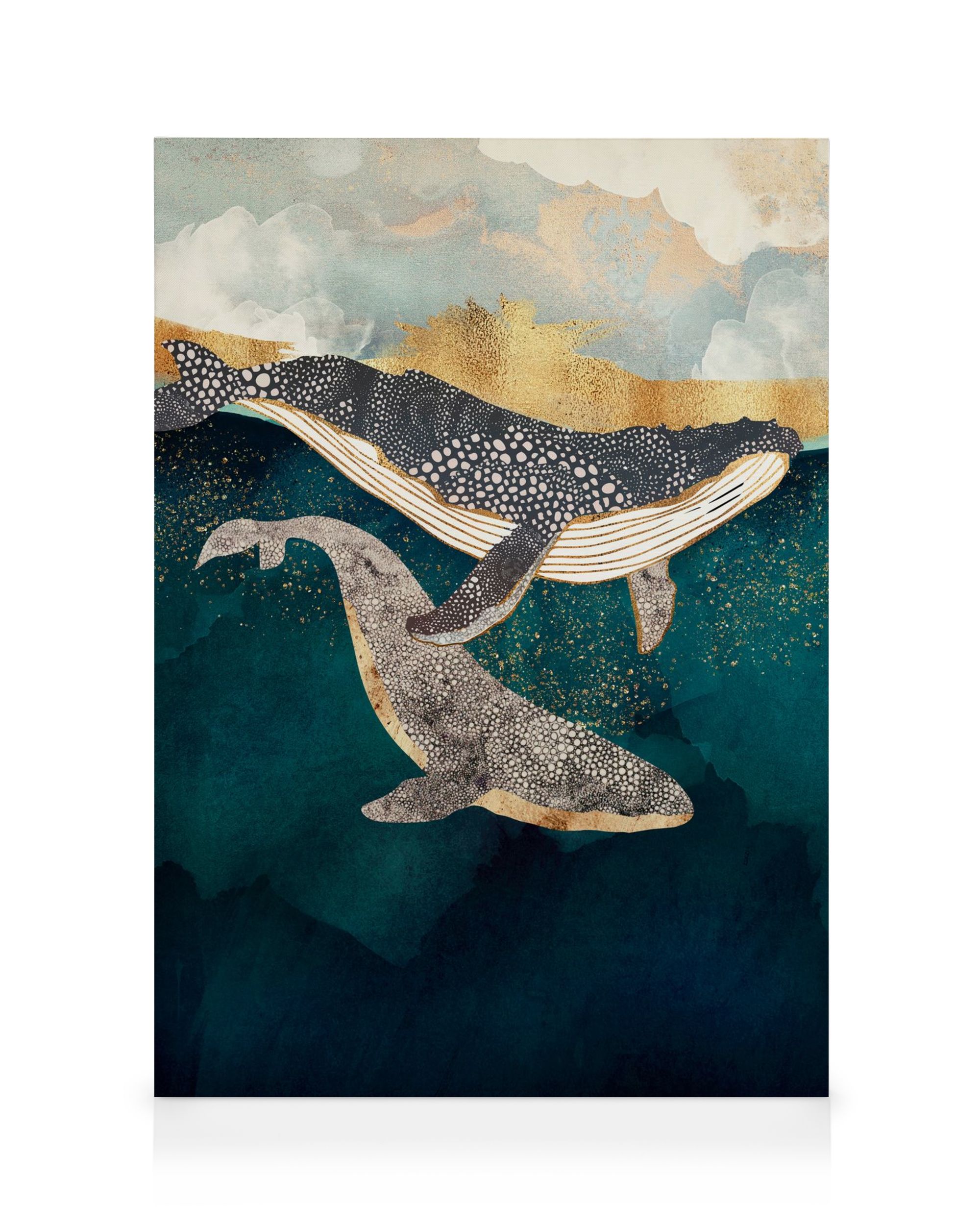 From €38.90Dive into the deep sea with this canvas duo with illustrations of whales and a crane. They are illustrated in black, white, and gold colours set against a captivating sea background in a dark blue colour. A striking combination for your home.