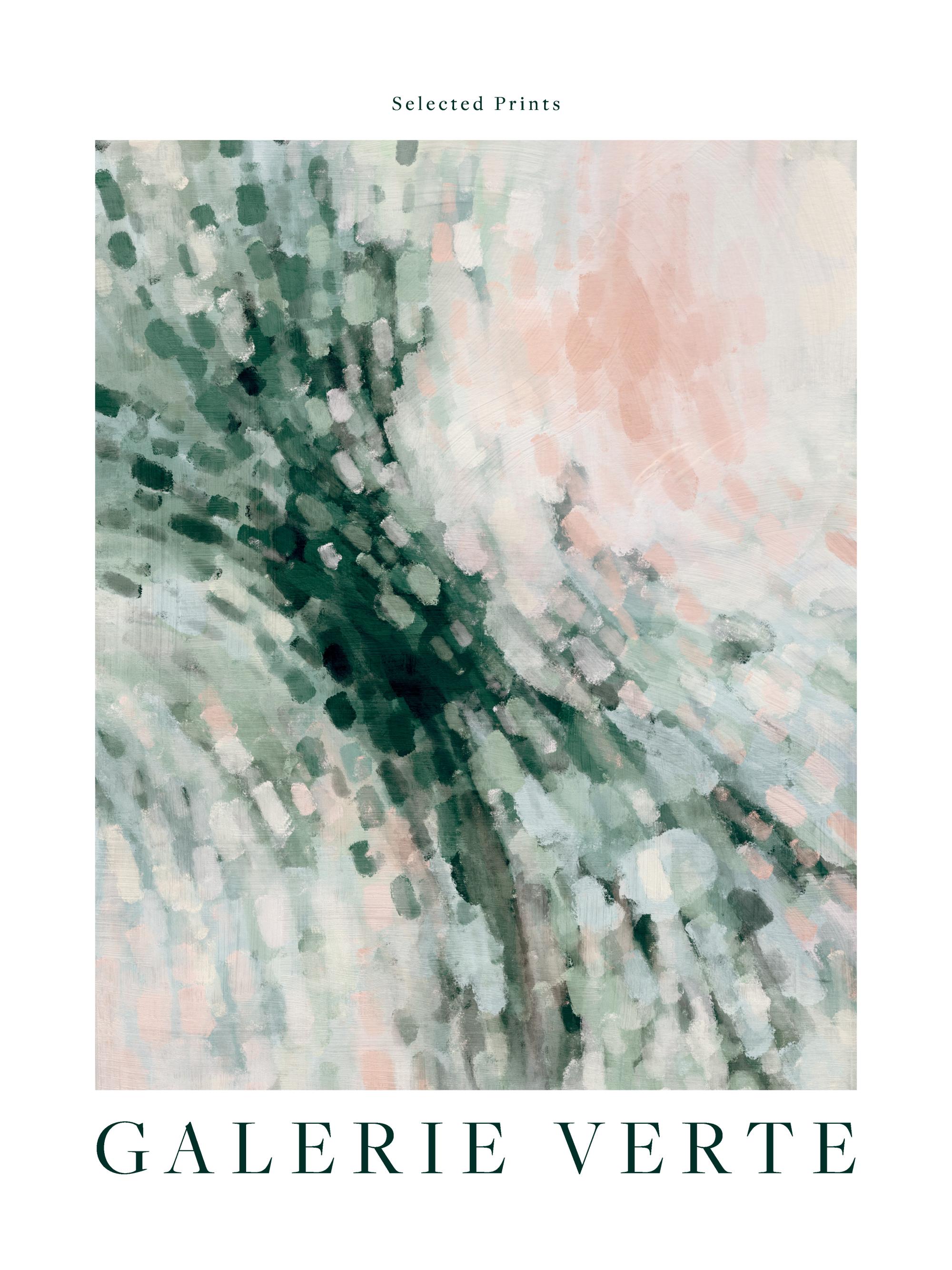 Artwork of several rounded squares in green, white and pink forming beautiful shapes and a text above and below in black with a white background. Match this poster with "Galerie Verte No1" for a perfect pair.