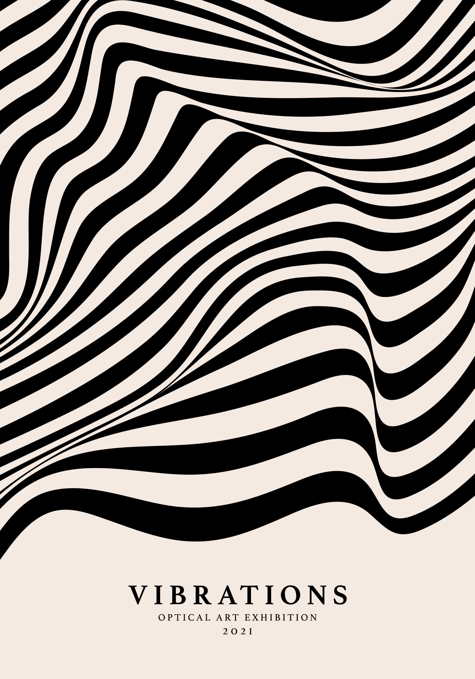 'A print with black lines shaped as vibrations along with the text ''Vibrations Optical Art Exhibition 2021''. This poster is perfect to style your home in a modern and trendy touch.'