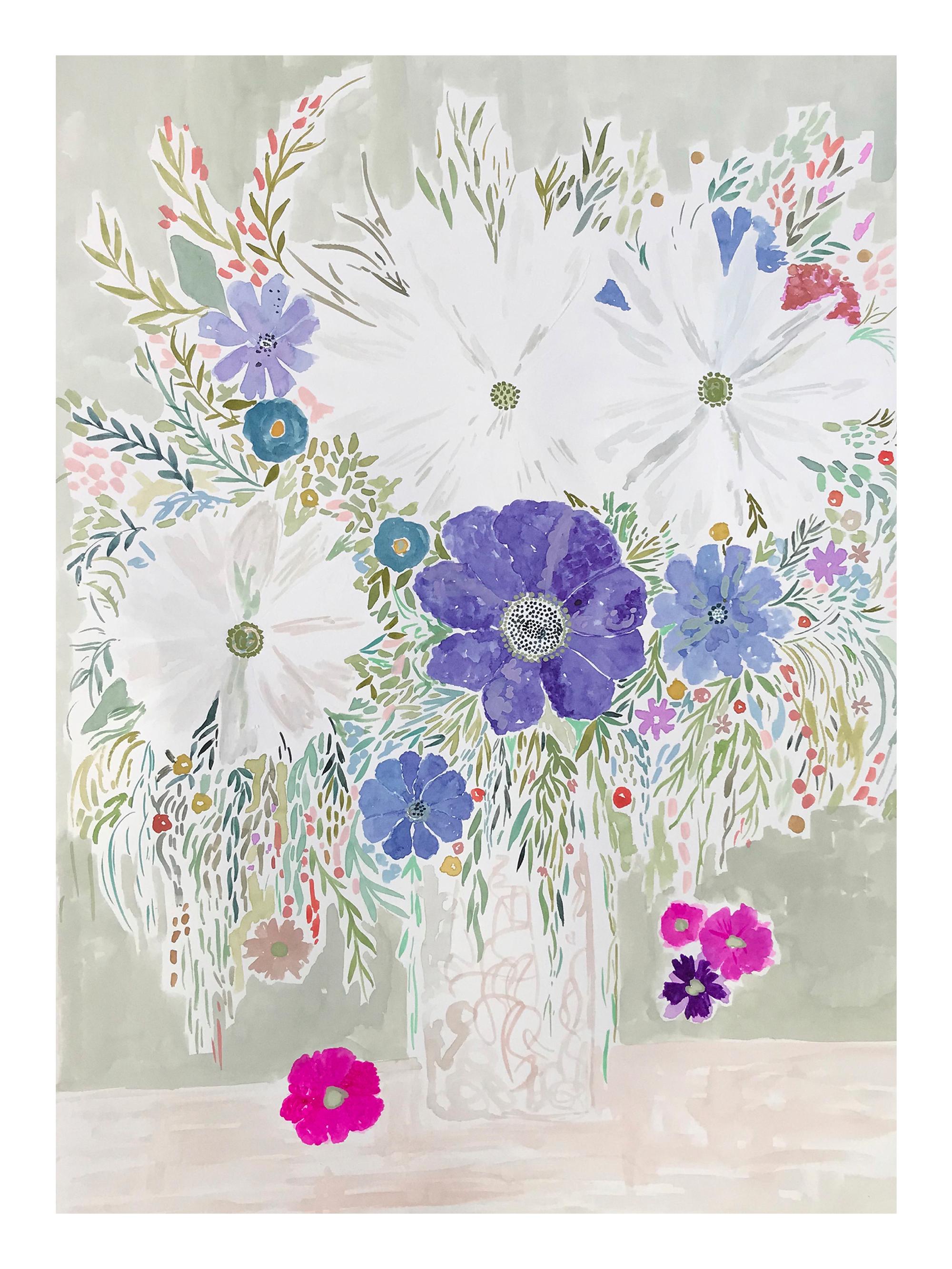 Beautiful illustration of wild flowers in white, pink and blue standing in a vase on a table with a light green wall in the background. Decorate your wall with this wonderful poster for a feeling of life in your home.